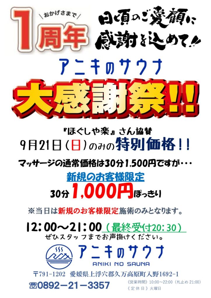 この度アニキのサウナはおかげさまで9月21日にオープン1周年を迎えます。