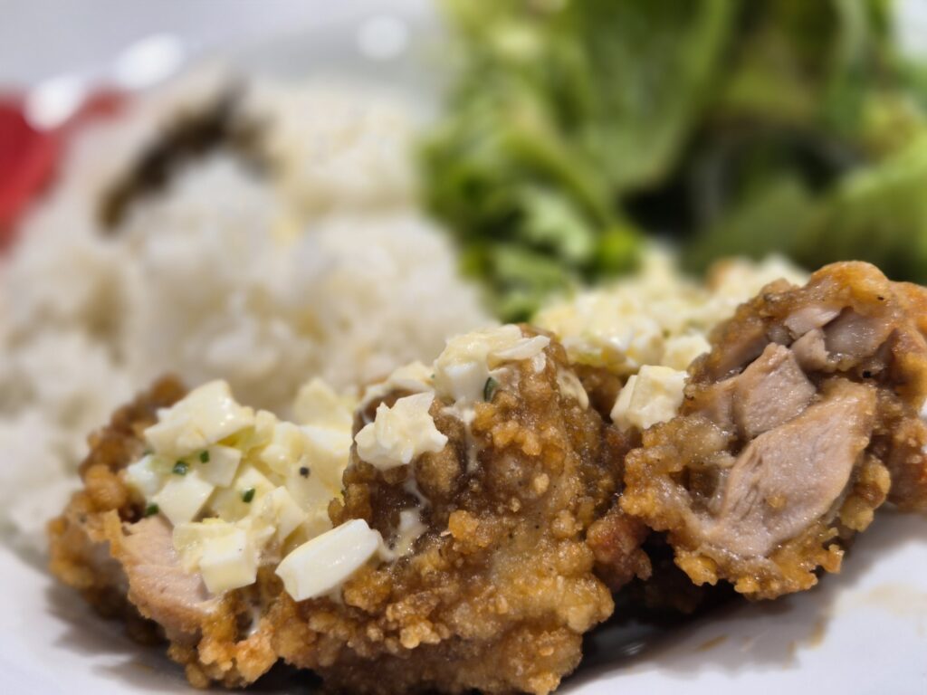 甘酸っぱいタレにくぐらせたジューシーな若鶏の唐揚げに、タルタルソースがかかった